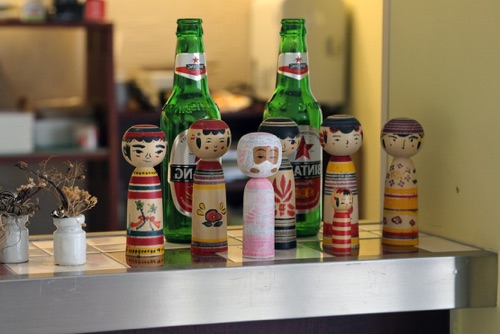 An encounter between two colored pieces of wood, a kokeshi (Japanese wood doll) and a pencil.