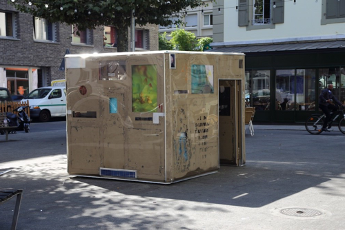 An acryl glass room in the middle of a square. Sometimes open, the visitors were welcome to sit down and enjoy some time together talking about this exhibition and else.